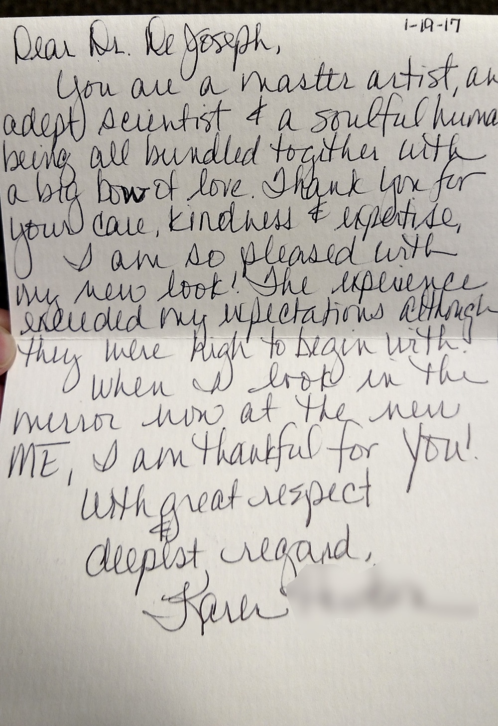 I had a mini-facelift, Necklift, and blepharoplasty with Dr. DeJoseph on June 23rd. I am very happy with my results so far. Dr. DeJoseph is a personable doctor with a great bedside manner. I found him through a search on the Internet. I had been unhappy with my profile, and was seeing a neck-jowl and saggy skin around my jawline. There was not a lot of pain with my procedure. The first couple of days were hard because of nausea, but other than that, it went smoothly. Dr. DeJoseph will get a recommendation from me.